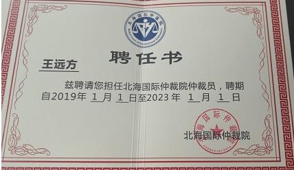 2019年,王遠(yuǎn)方律師受聘為北海國(guó)際仲裁院仲裁員 北海國(guó)際仲裁院王遠(yuǎn)方在北海國(guó)際仲裁中心