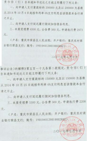 兩次借款35萬元,限期2個月還清。先扣出未約定利息11.3萬元,6個月又還30萬元,共還41.3萬元。未約定借期內利率,也未約定逾期利率,出借人主張借款人自逾期還款之日起按照年利率6%支付資金占用期間利息的,人民法院應予支持;本金35萬+(35萬元×年利率6%)2.1萬元=應還37.1萬元;已還41.3萬元-應還37.1萬元=多還4.2萬元。然而,已過訴訟時效,出借人將借款人推上被告席,法院以借款人通訊地址不祥,發(fā)公告送達開庭傳票,缺席審理并判決。法院未給借款人判決書,僅一份證明即判決生效,再將執(zhí)行決定書郵寄到借款人收件地點。法院已執(zhí)行5萬元,還差384901元。近日,重慶市榮昌區(qū)人民法院以(2017)渝0153執(zhí)恢882號、(2017)渝0153執(zhí)恢881號執(zhí)行裁定對出借人陳曉濤、李銘與借款人李秉斐合同糾紛一案終結執(zhí)行,現因陳曉濤發(fā)現李秉斐有可供執(zhí)行的財產,該院決定正式進入執(zhí)行程序。 兩次借款35萬元,限期2個月還清,扣出未約定利息11.3萬元,實際轉存23.7萬元 李秉斐因資金周轉,兩次向重慶市榮昌區(qū)畜牧獸醫(yī)局一在職職工陳曉濤借款共計35萬元。 2014年3月2日,借條一張,金額20萬元,限期2個月,約定在同年5月2日前還清。借據形成后當日,陳曉濤來到中國農業(yè)銀行股份有限公司重慶榮昌區(qū)支行,先扣出未約定利息4.7萬元,再從自己賬戶轉存15.3萬元到李秉斐賬戶。 2014年5月4日,借條一張,金額15萬元,限期2個月,約定在同年7月4日前還清。借據形成后當日,陳曉濤又來到農業(yè)銀行榮昌區(qū)支行,仍先扣出未約定利息6.6萬元,再從自己賬戶轉存8.4萬元到李秉斐賬戶。 兩次借款前扣出未約定利息11.3萬元,實際轉存23.7萬元。 ![]() ▲兩張借條35萬元、實際轉存23.7萬元清單 還30萬元+扣未約定利息11.3萬元=已還41.3萬元。本金35萬元+(35萬元×年利息6%×6個月)2.1萬元=還要還款37.1萬元。已還41.3萬元-還要還款37.1萬元=多還4.2萬元 從2014年3月2日到2014年9月6止,僅僅6個月,李秉斐通過農村商業(yè)銀行手機轉賬,九次給陳曉濤還款共計16.5萬元。即:3月6日轉賬2萬元;5月6日轉賬2萬元;6月4日轉賬2萬元;6月23日轉賬1.5萬元;7月5日轉賬2萬元;7月26日轉賬1.5萬元;8月8日轉賬2萬元;8月25日轉賬1.5萬元;9月6日轉賬2萬元;8月29日通過農業(yè)銀行網銀轉賬13.5萬元。 李秉斐通過兩家銀行給陳曉濤轉賬還款共計30萬元+扣出未約定利息11.3萬元=已還41.3萬元。 ![]() ▲農村商業(yè)銀行、農業(yè)銀行轉賬還款30萬元清單 依據2015年9月1日《最高人民法院關于審理民間借貸案件使用法律若干問題的規(guī)定》第二十九條第二款第一節(jié)之規(guī)定:“未約定借期內的利率,也未約定逾期利率,出借人主張借款人自逾期還款之日起按照年利率6%支付資金占用期間利息的,人民法院應予支持。”按規(guī)定計算,本金35萬元+(35萬元×年利率6%)2.1萬元=應還37.1萬元。 扣出未約定利息11.3萬元+轉賬30萬元=已還41.3萬元。 已還41.3萬元-應還37.1萬元=多還4.2萬元,應由陳曉濤退給李秉斐。 已過訴訟時效,發(fā)公告送達開庭傳票,缺席審理并判決李秉斐還本金35萬元,支付利息2.1萬元(本金35萬元×年利率6%)、案件受理費7600元、公告費1120元、申請執(zhí)行費4505元 ![]() ▲借款時間2014年3月2日更改為2014年8月3日 ![]() ▲借款時間2014年5月4日更改為2014年8月24日 陳曉濤不但沒退4.2萬元給李秉斐,還要李秉斐還本金35萬元,并支付從借款之日起按月利率2%計算支付利息至該借款付清時止,共計36.4萬元。 并且,按照法律規(guī)定,已過訴訟時效法院不予支持。然而,陳曉濤將2014年3月2日借款20萬元時間更改為2014年8月3日、2014年5月4日借款15萬元時間更改為2014年8月24日后,榮昌區(qū)法院卻支持他在2016年6月23日的立案請求。 在榮昌區(qū)法院作出(2016)渝0153民初3701號、(2016)渝0153民初3702號民事判決書上,李秉斐家庭住址是榮昌區(qū)東大街57號1單元4-2。李秉斐的母親梁太英為了更方便郵政及時送達,將榮昌區(qū)東大街43號門面地址、聯系電話159XXXX1529留給法院,收件人梁婷雯,李秉斐的姐姐。然而,法院以李秉斐通訊地址不祥為由,公告送達開庭傳票,缺席審理后作出判決。 法院認為,合法的借貸關系受法律保護。陳曉濤向李秉斐提供了借款,借款到期后李秉斐應依約償還借款。同時,雙方對該借款未約定借款利息和逾期利率,按照法律規(guī)定陳曉濤可主張自逾期還款之日起按照年利率6%支付資金占用期間的利息。 判令李秉斐于本判決生效后十日內償還本金20萬元、15萬元,并以20萬元、15萬元為基數,從2014年10月25日起按年利率6%支付利息至該借款本金付清之日止。20萬元、15萬元兩起案件受理費7600元、公告費1120元,共計8720元,由李秉斐負擔。 ![]() ▲已過訴訟時效的執(zhí)行決定書 2017年5月26日中午,榮昌法院執(zhí)行局向法官將李秉斐從重慶某賓館抓回來法院2樓,對李秉斐的母親梁太英說李秉斐還欠陳曉濤借款,6月20日梁太英才到榮昌法院去找向法官復印了判決書,但剝奪了李秉斐的上訴權。 榮昌法院以李秉斐通訊地址不祥為由,公告送達開庭傳票,2017年7月22日榮昌區(qū)東大街43號門面李秉斐的姐姐梁婷雯卻又收到了榮昌法院郵寄來的(2017)渝0153執(zhí)恢復511號、(2017)渝0153執(zhí)恢復512號恢復執(zhí)行通知書、限制高消費令、報告財產令、財產申報表、執(zhí)行決定書,并要李秉斐承擔兩次公告費